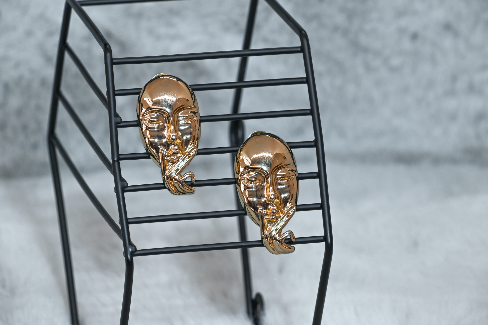 Brinco banhado a ouro com design artístico em formato de rosto abstrato, inspirado no estilo escultural contemporâneo. Uma peça marcante que une personalidade e estilo, ideal para quem ama acessórios autorais.
