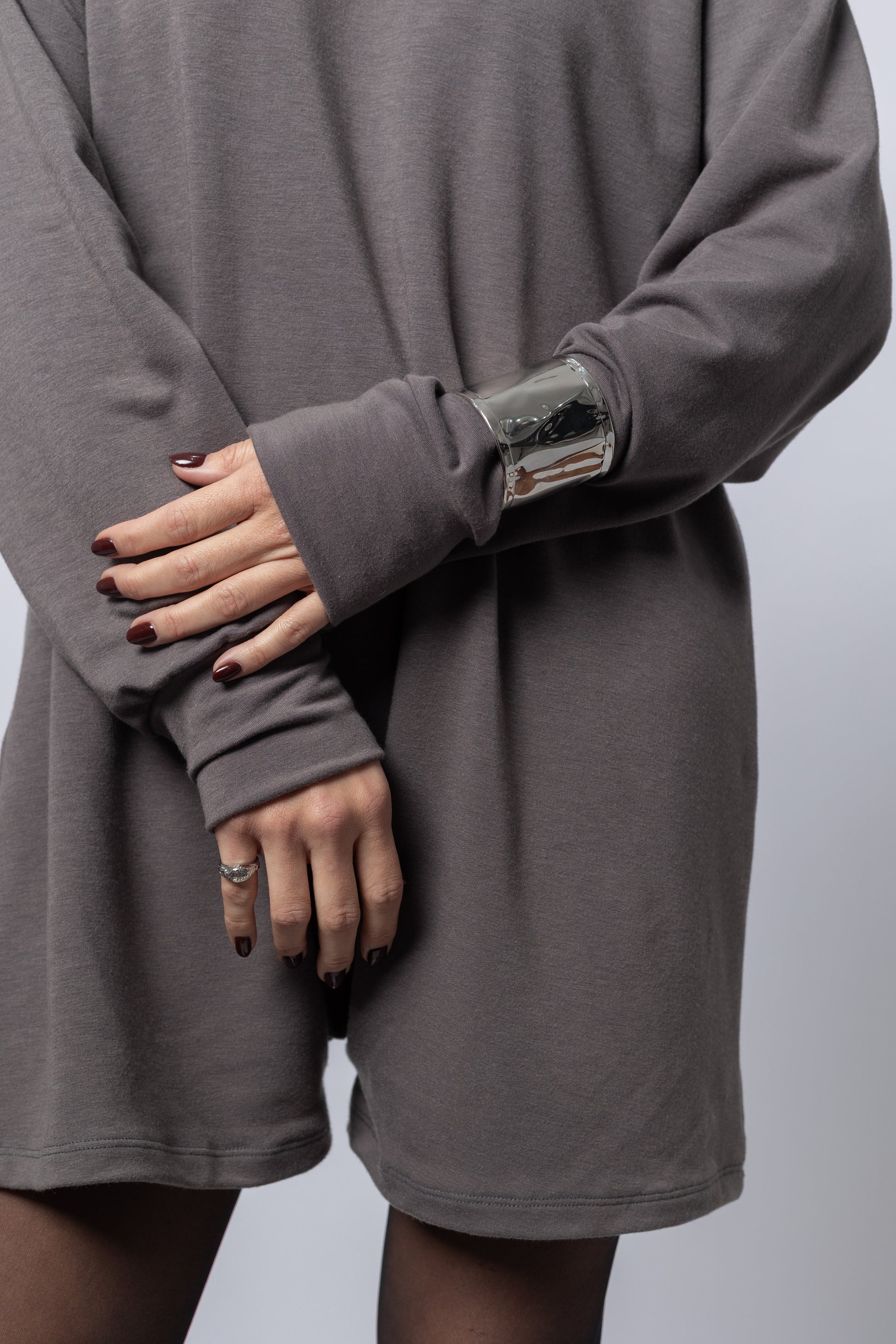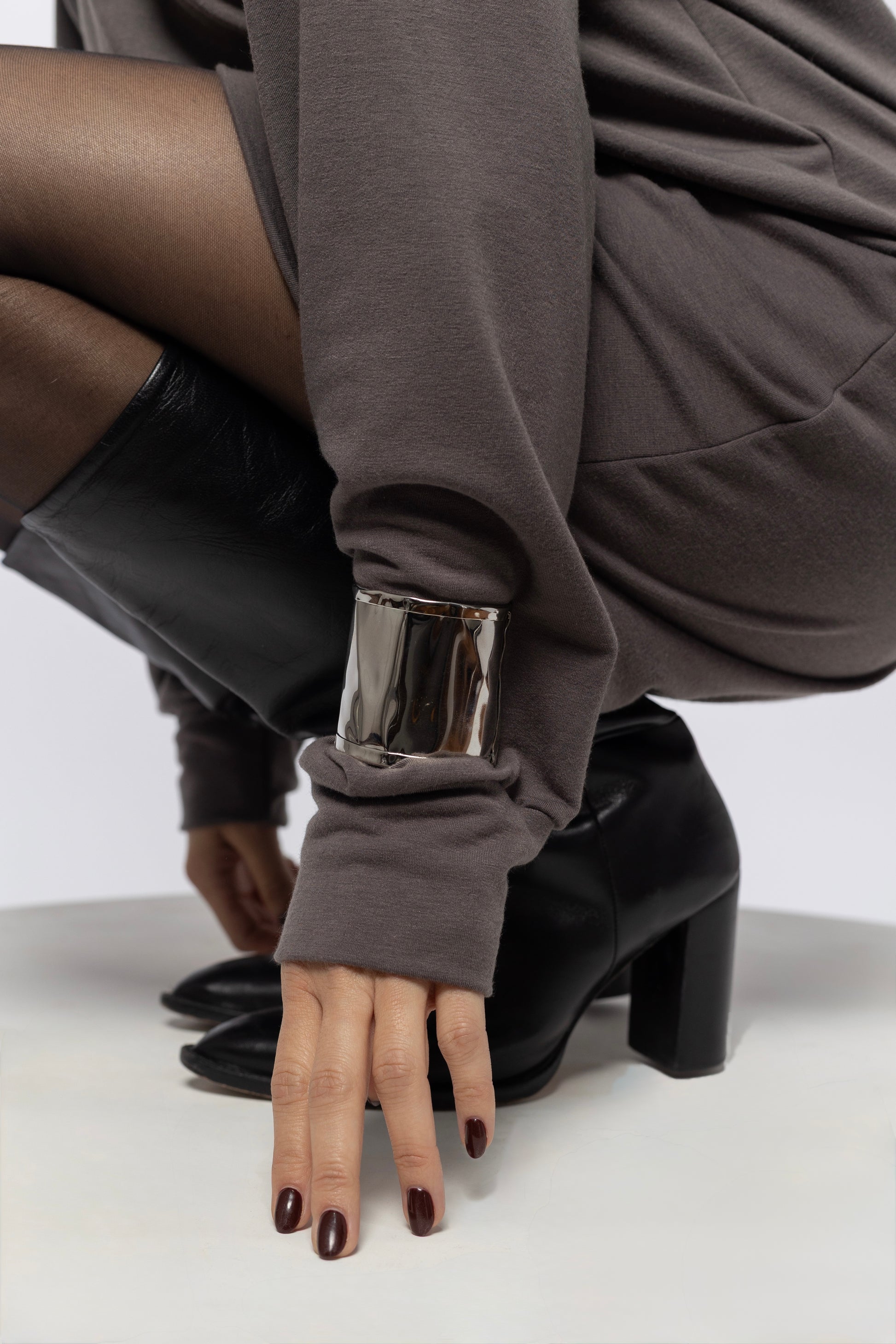 Este bracelete moderno banhado a prata é uma peça marcante e sofisticada. Seu design largo e aberto proporciona conforto no uso, além de transmitir presença e elegância em qualquer ocasião.