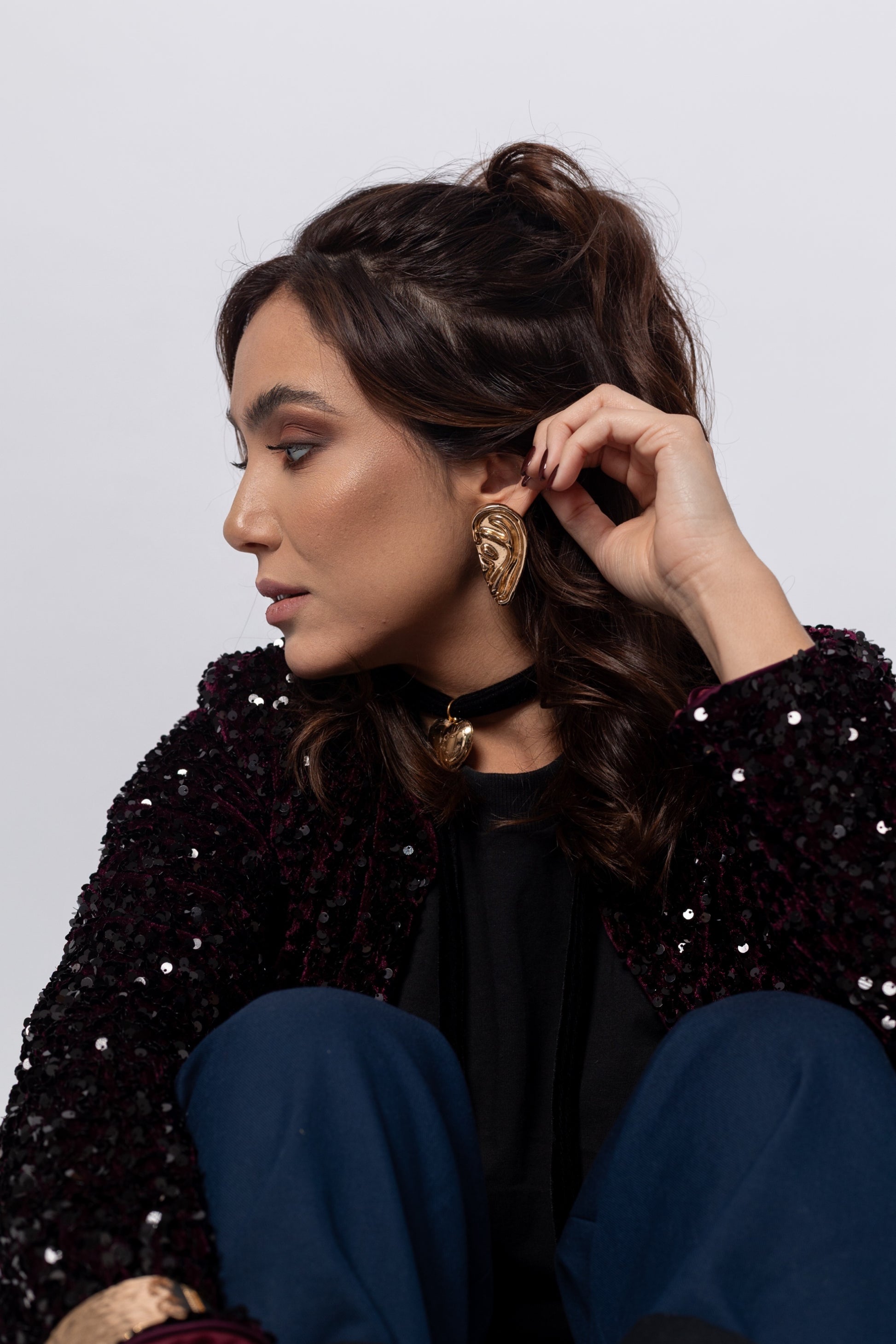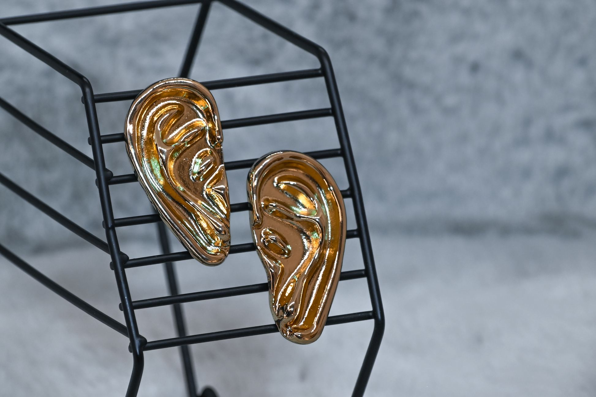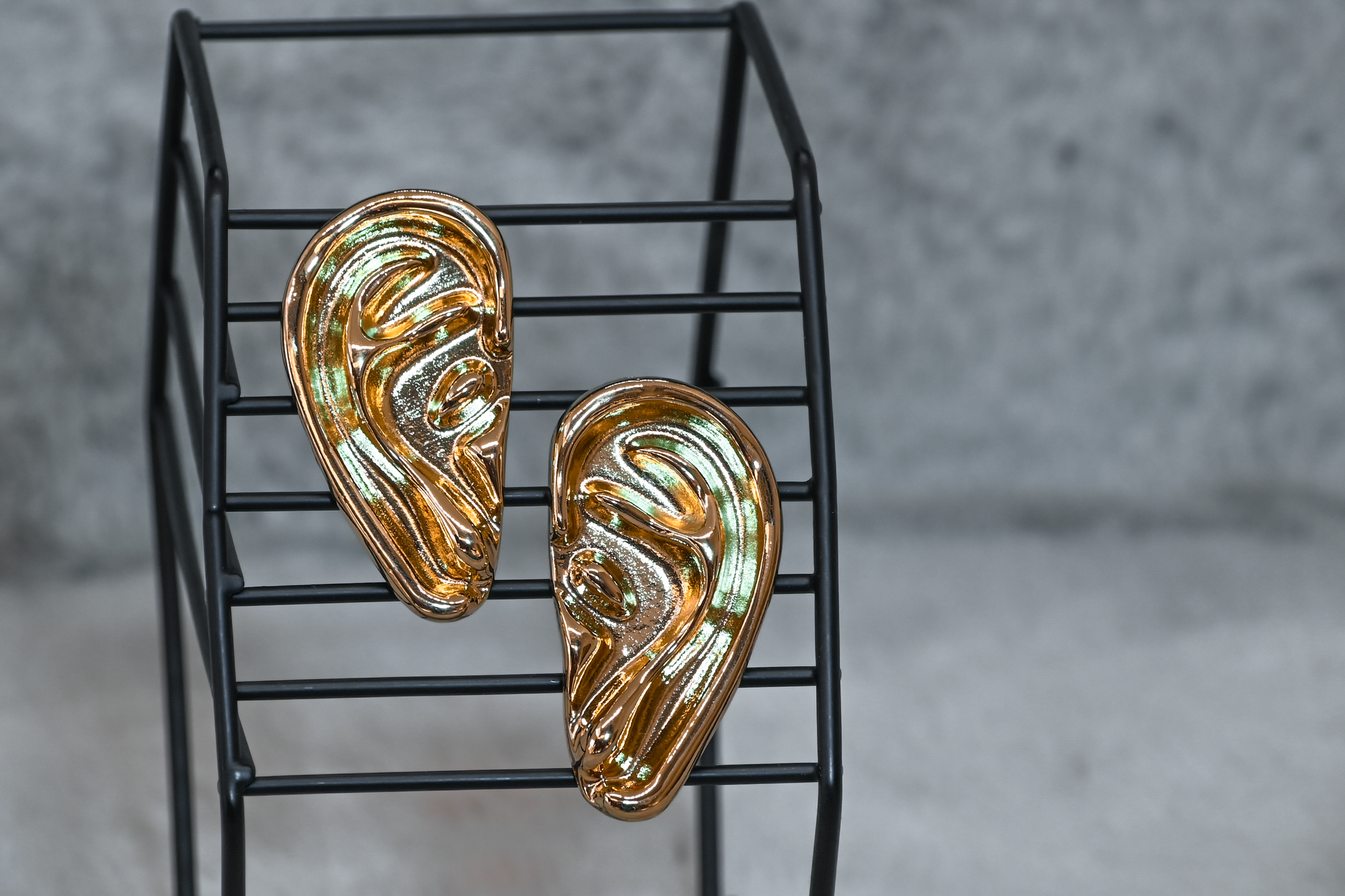 Brinco statement com design de orelha em estilo artístico e acabamento banhado a ouro polido. Uma peça ousada e criativa que transforma o visual com autenticidade e toque moderno.