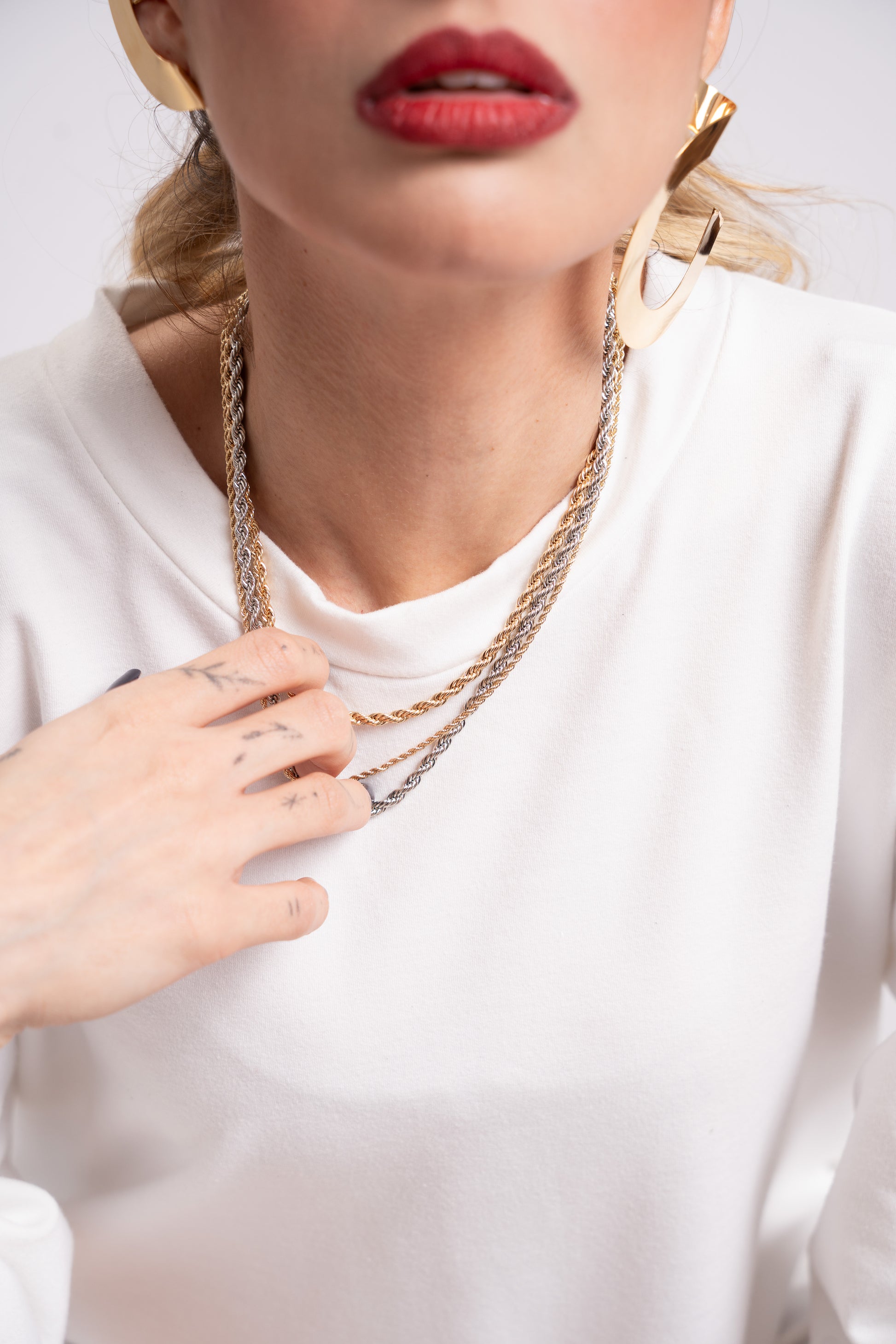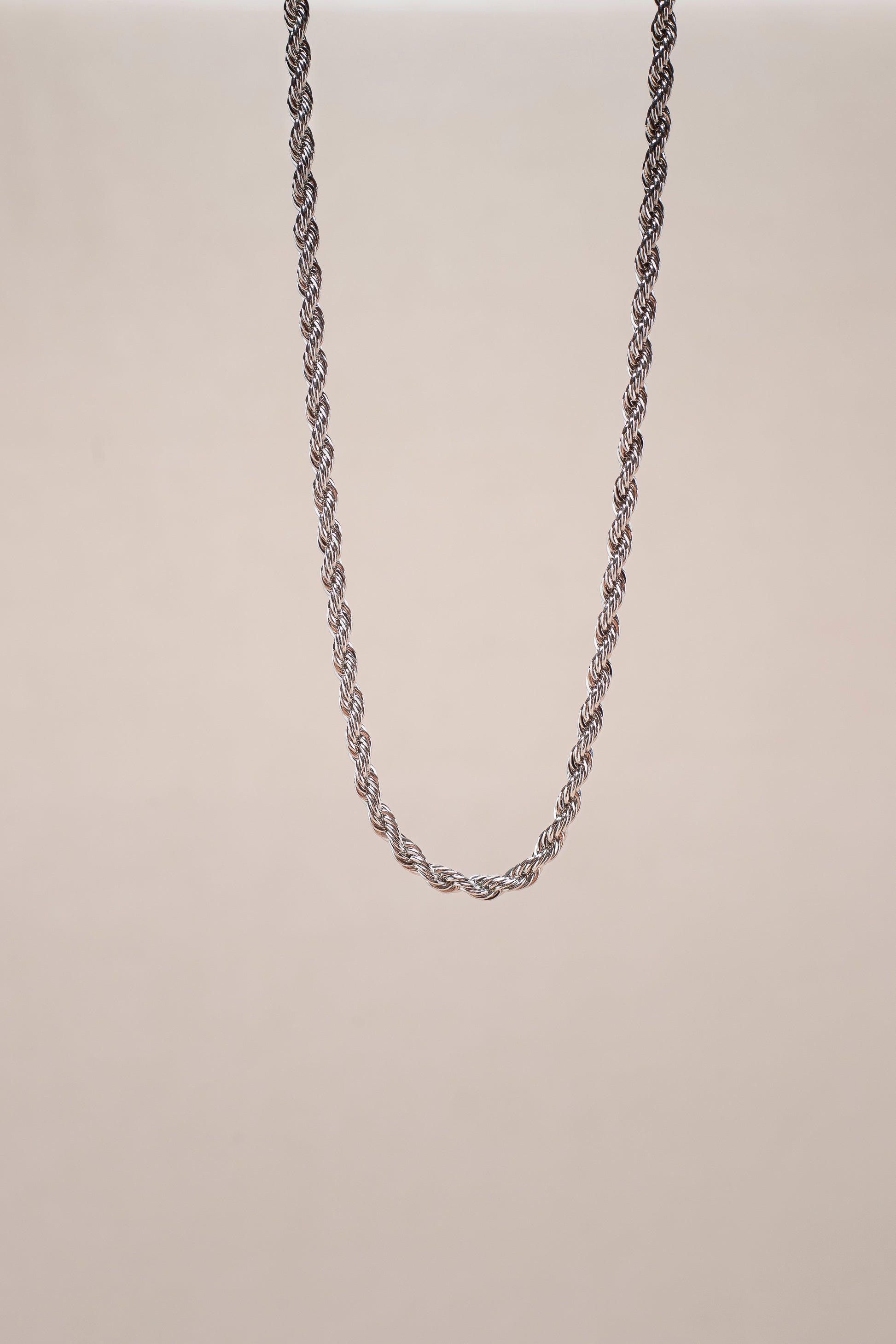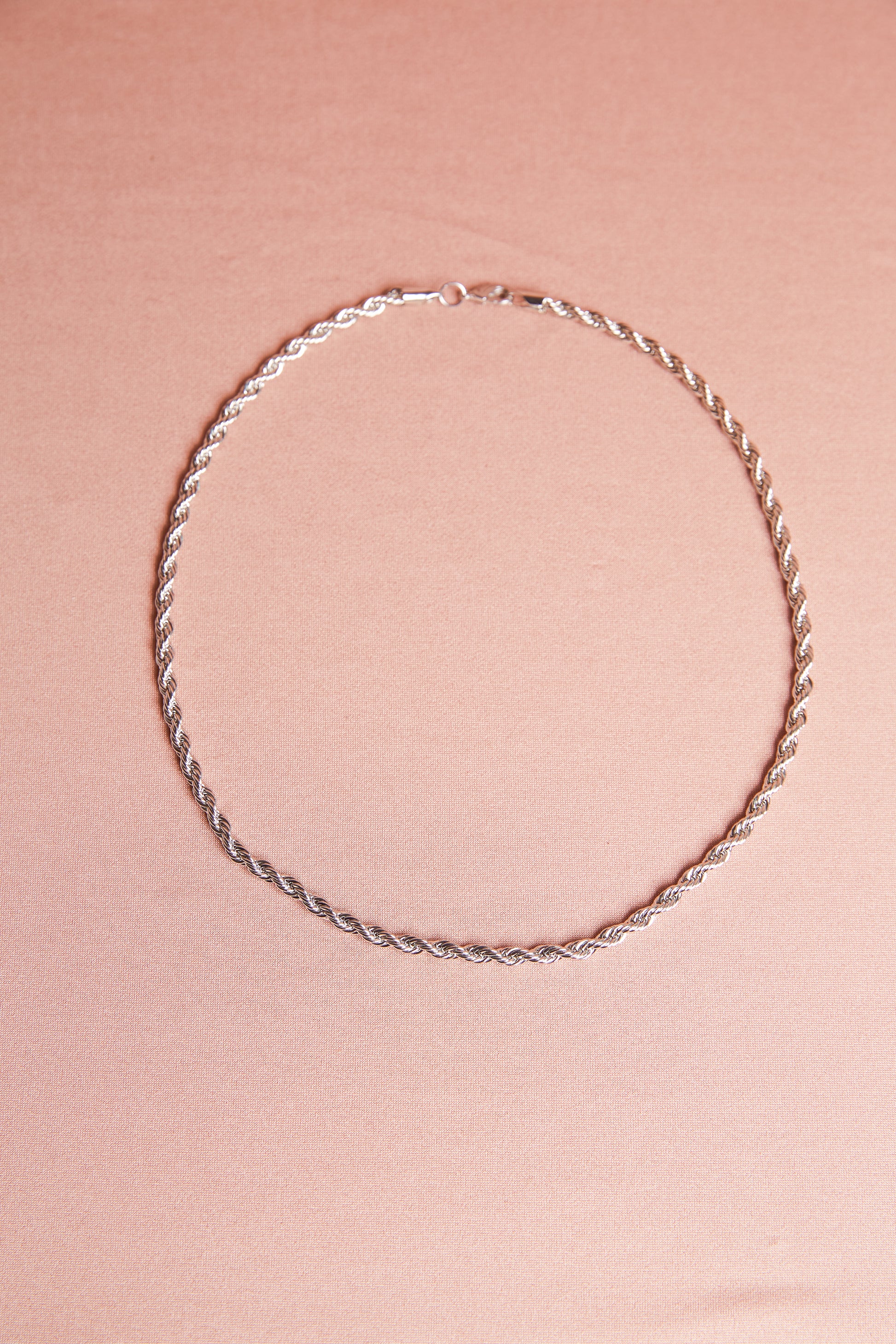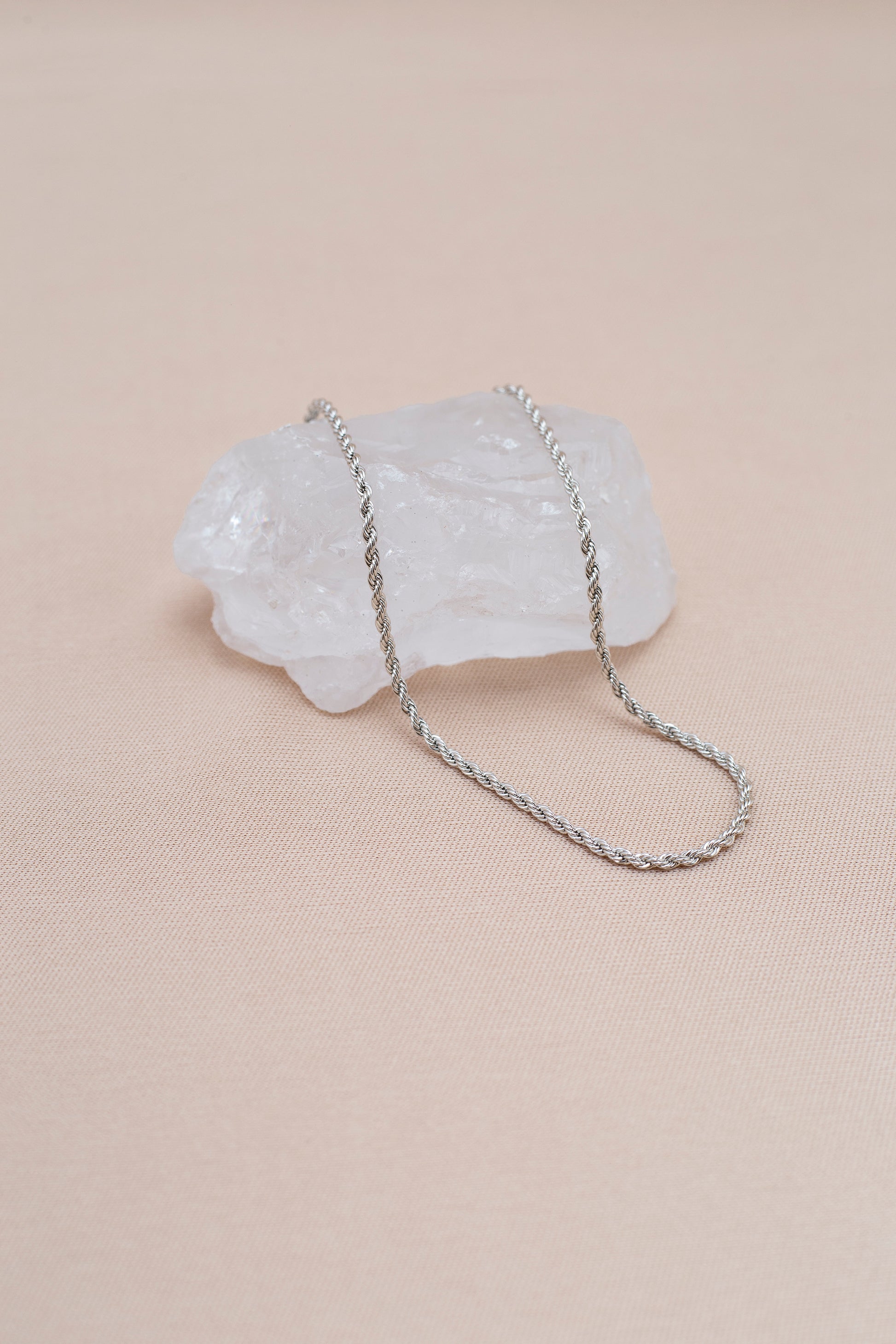 Colar banhado a prata com trama torcida, criando um efeito de volume sutil e elegante. Uma peça clássica que funciona sozinha ou em mix de colares, trazendo brilho na medida certa.