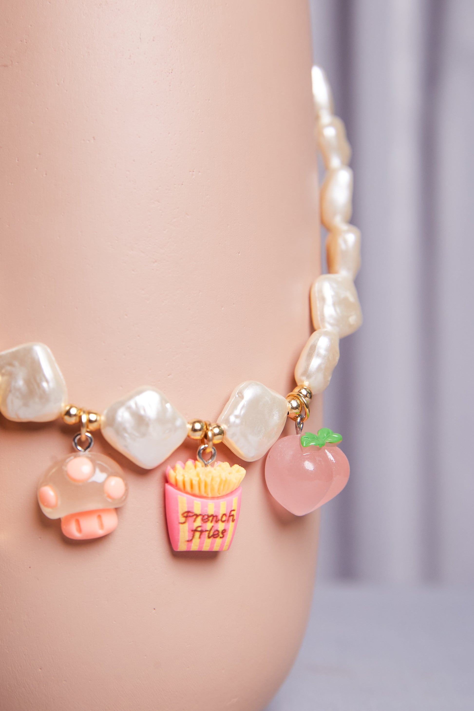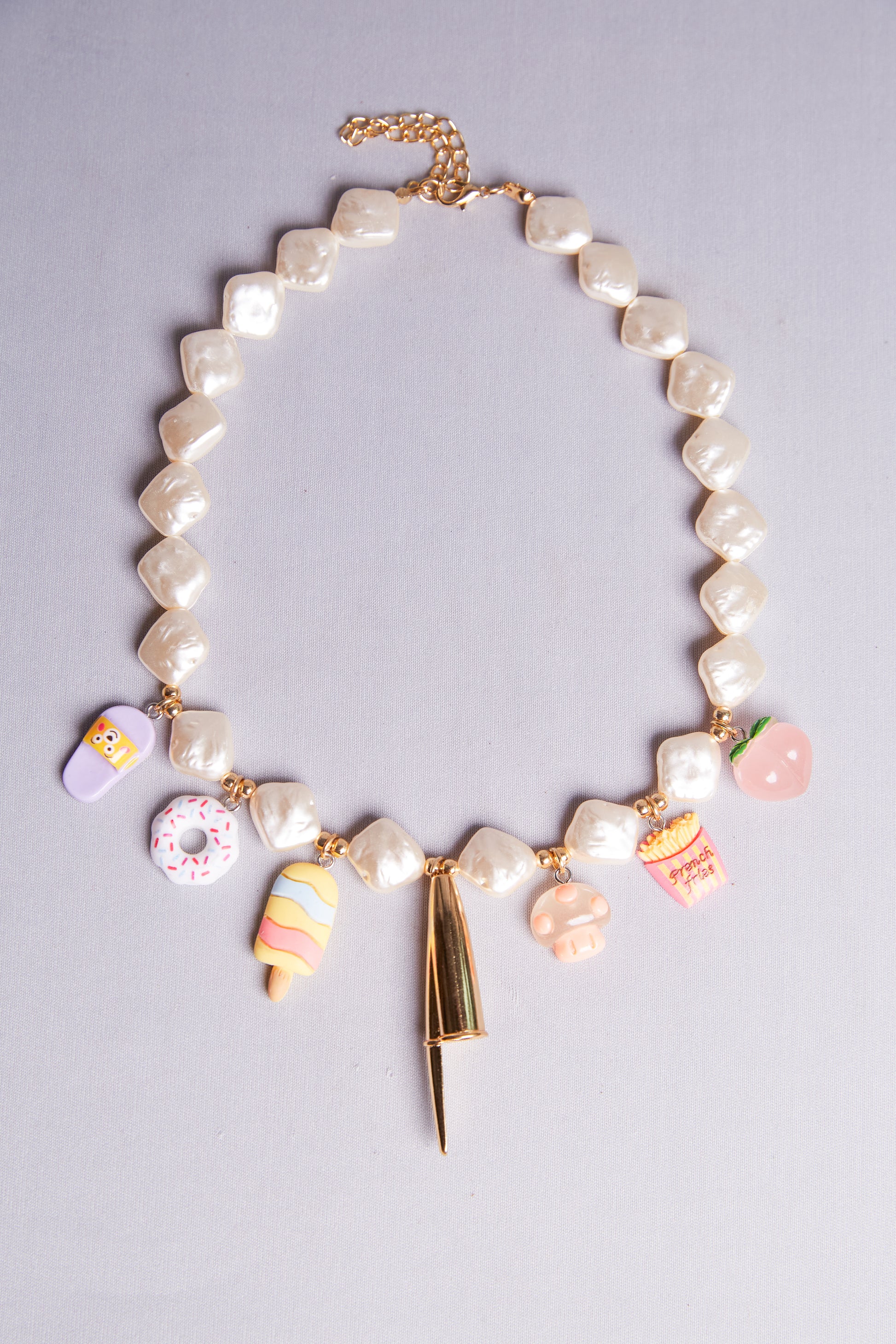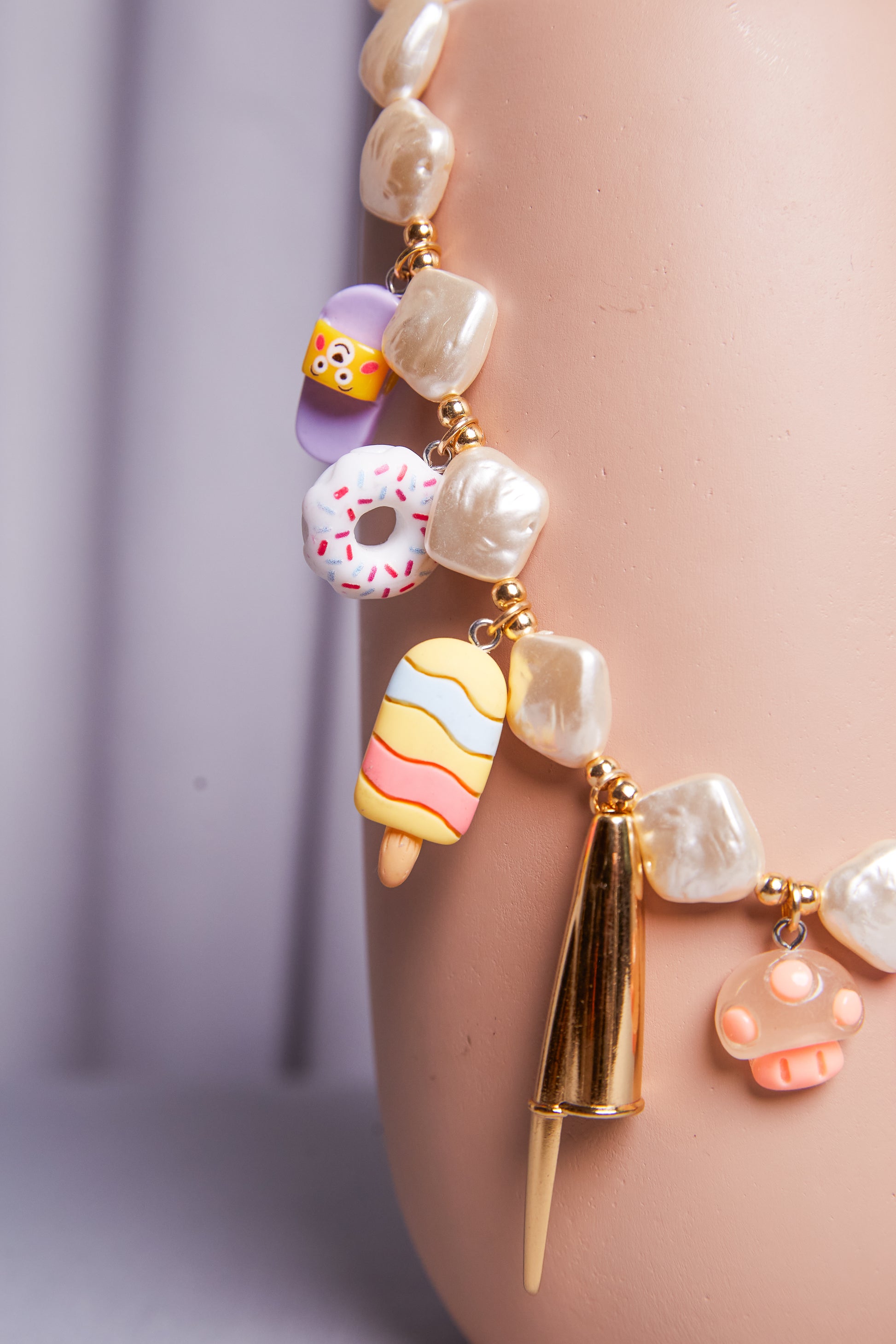 Banhado a ouro e pérolas irregulares, com cores e design irreverente. Um acessório para ousar sem medo.