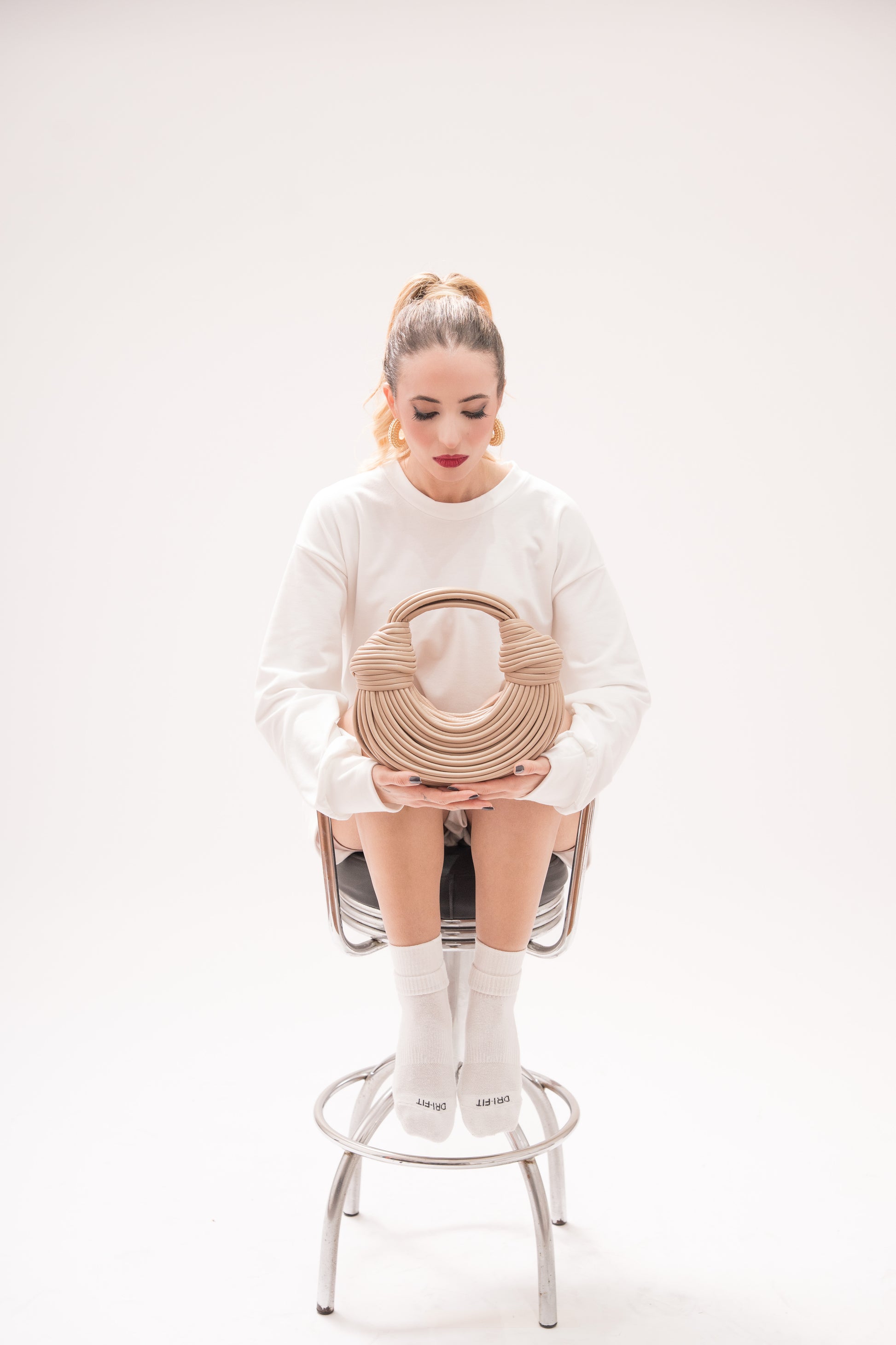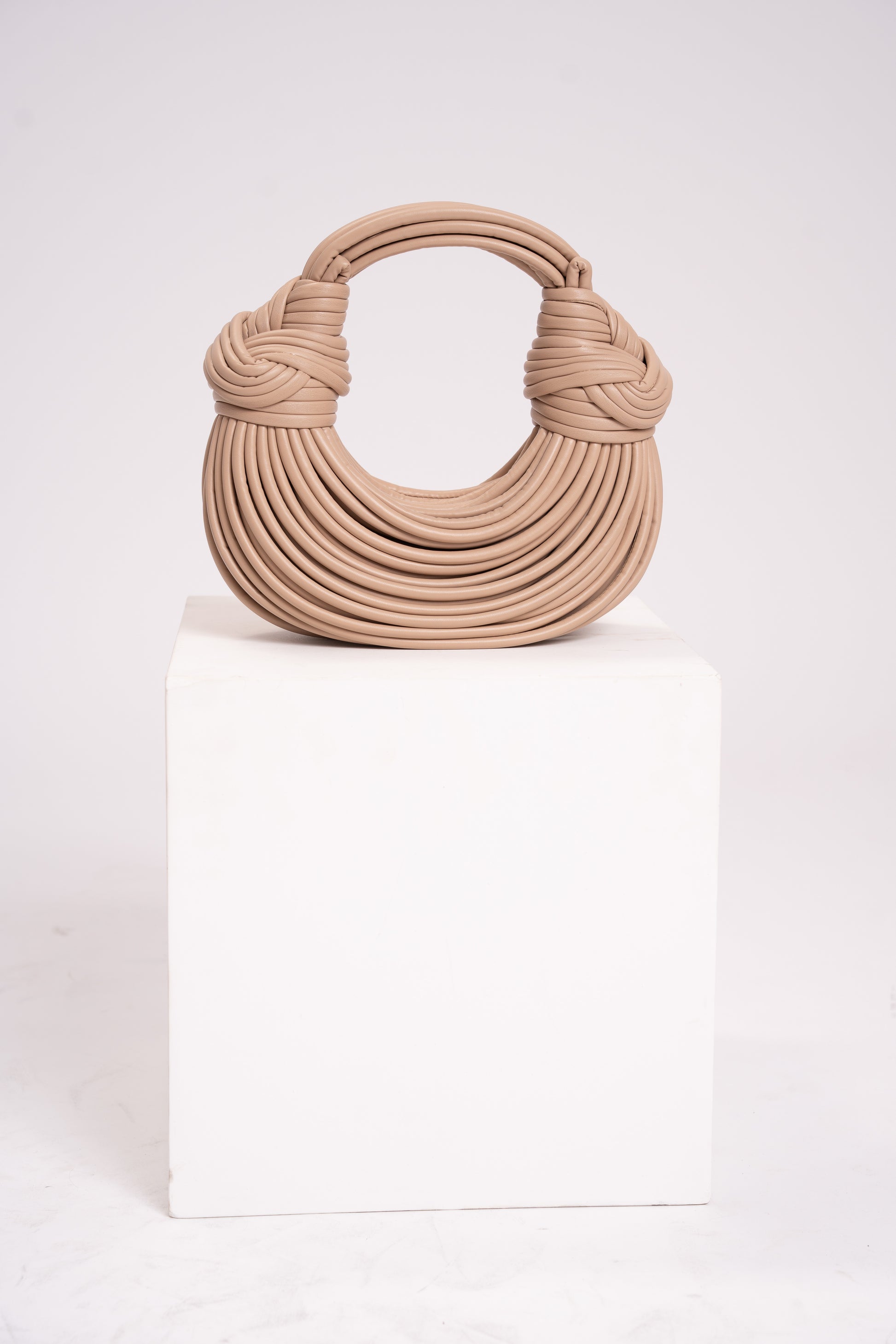 Bolsa de design escultural e contemporâneo, construída a partir de tiras contínuas que formam um efeito de trama orgânica e volumosa. Seu formato curvo, a alça integrada com nós estruturais nas laterais reforça o visual artesanal, sofisticado e original da peça. Uma bolsa marcante, ideal para produções modernas e elegantes.
