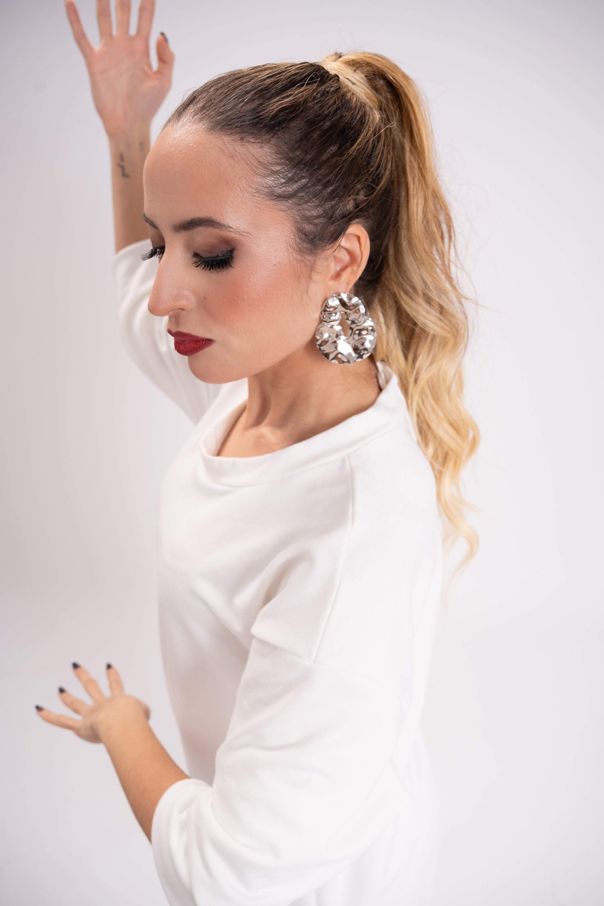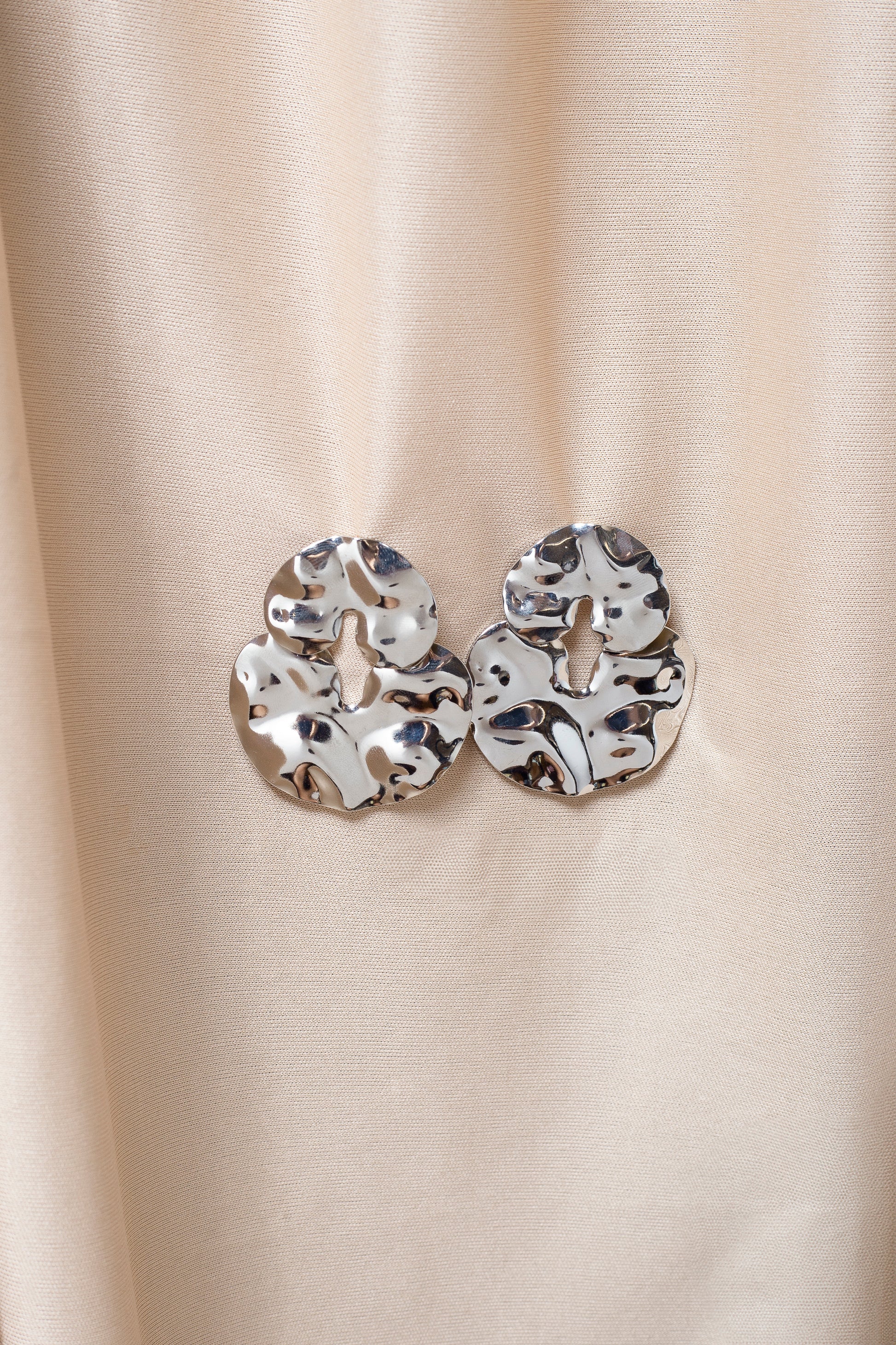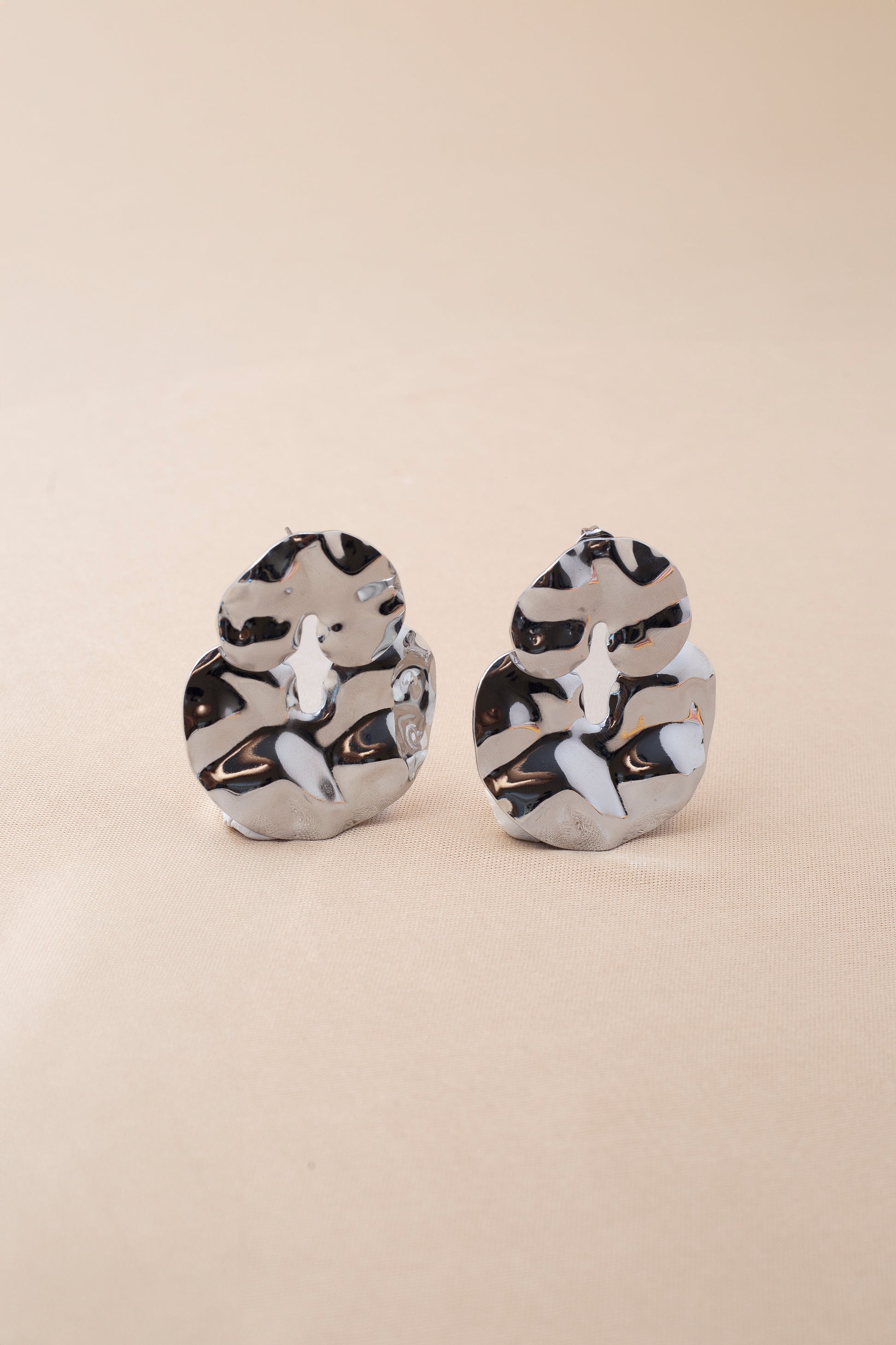 Brinco banhado a prata com formas orgânicas e textura martelada, inspirado no design contemporâneo. Imponente e elegante, adiciona personalidade ao look sem perder a sofisticação.