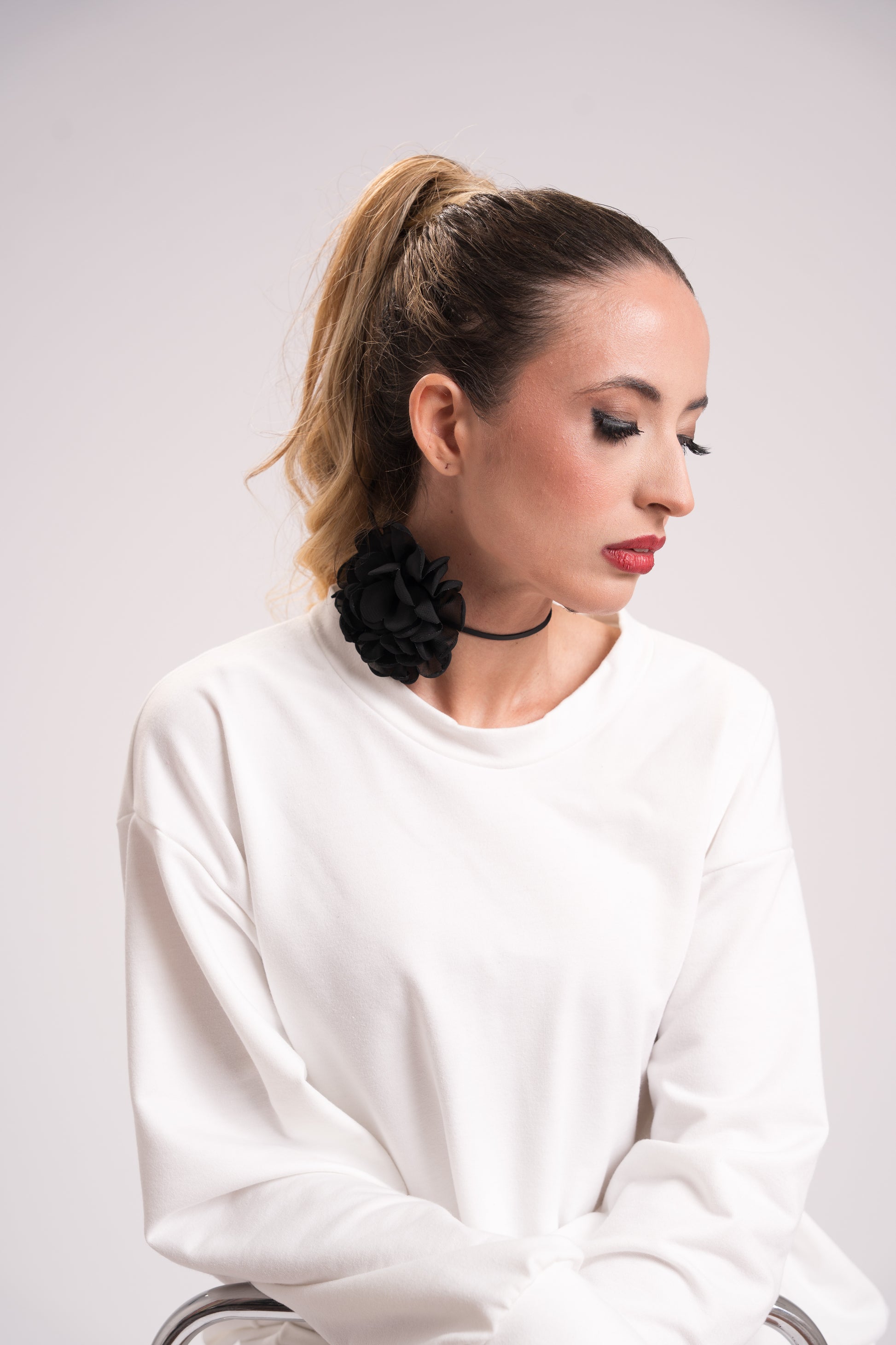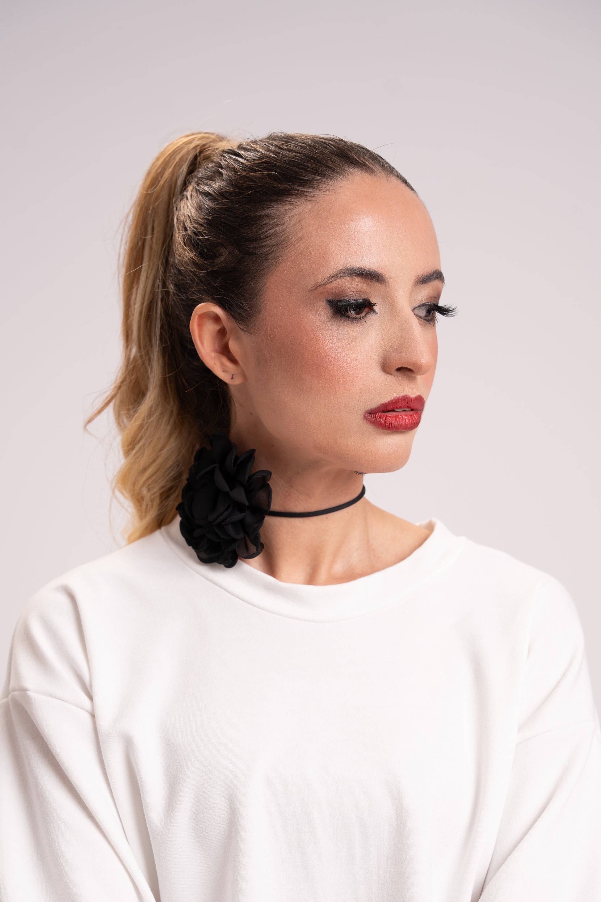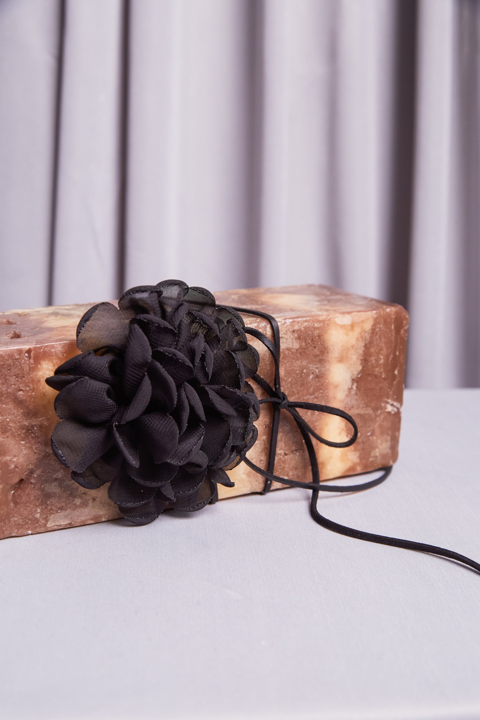 Gargantilha preta com flor em tecido aplicada em destaque. Um acessório que transforma qualquer look básico em algo estiloso e atual, com aquele toque fashion imediato.