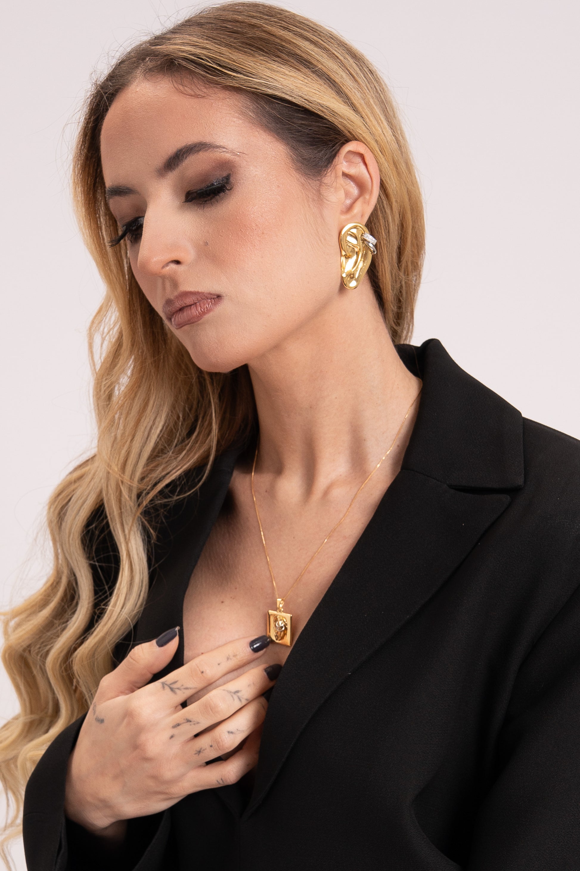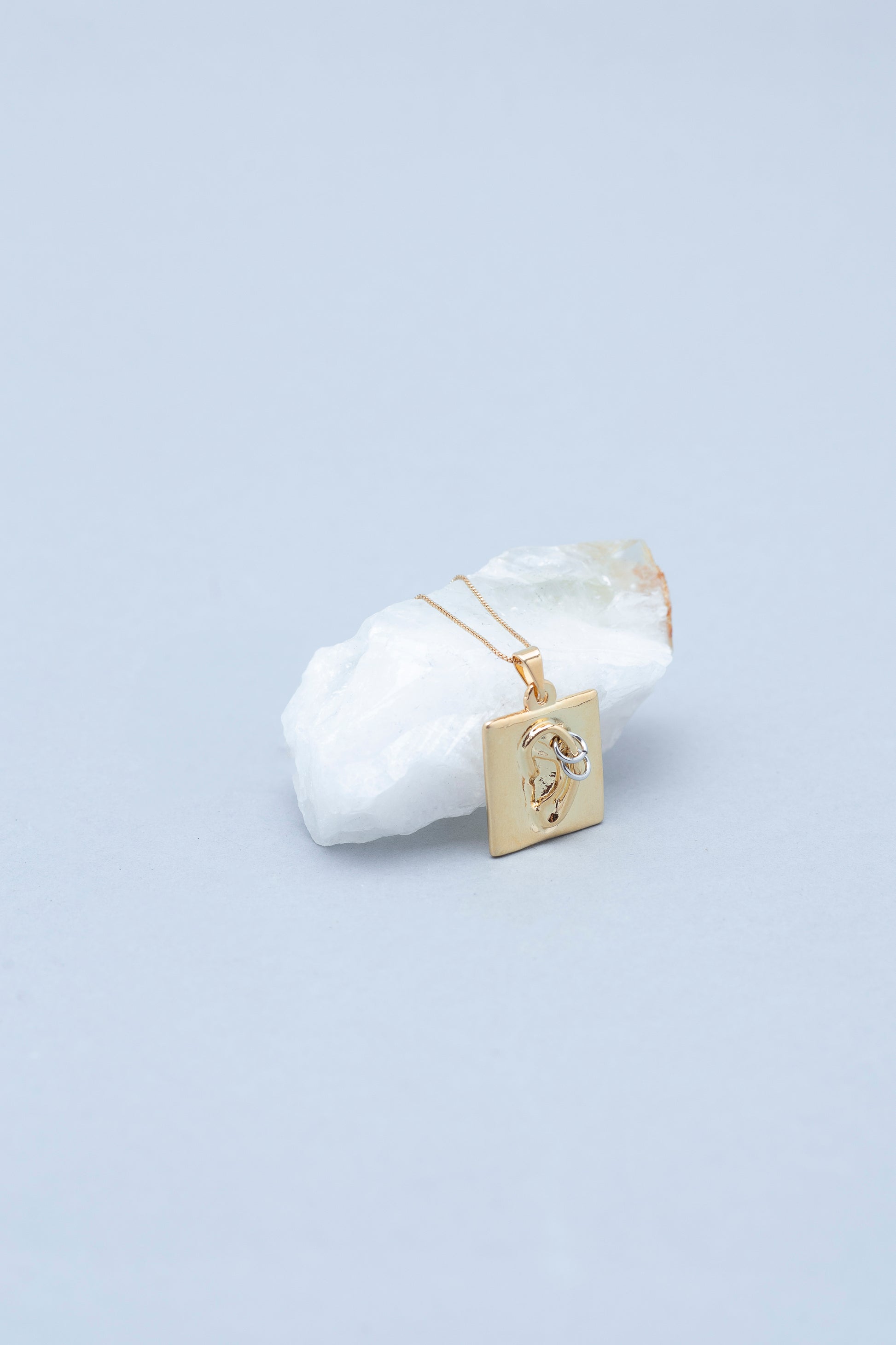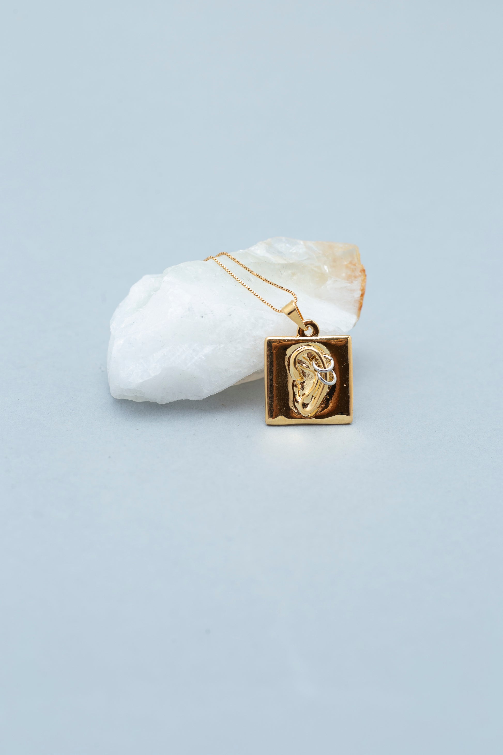 Um colar delicado, banhado a ouro, com corrente fina e leve que deixa todo o destaque para o pingente: uma pequena orelhinha em relevo com um mini piercing. Perfeito pra quem gosta de acessórios fora do óbvio, mas ainda com um toque minimalista.