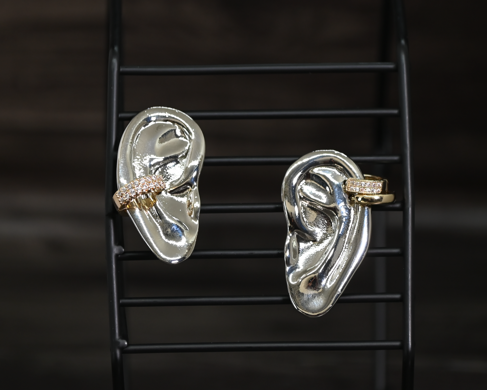 Peça artística em formato de orelha com detalhe de piercing, banhada a prata e design inovador, perfeito para transformar o visual com estilo e autenticidade.