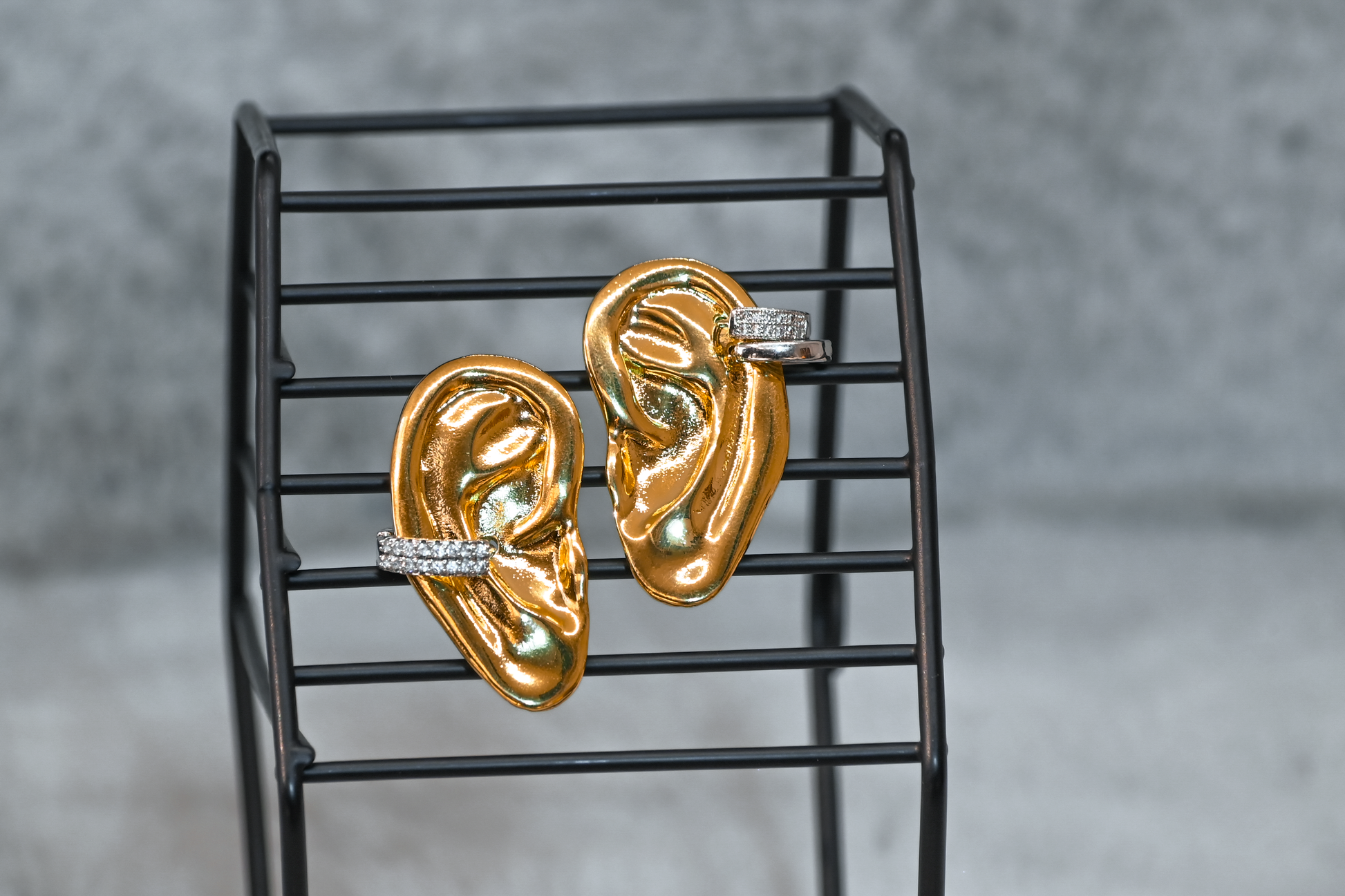 Peça artística em formato de orelha com detalhe de piercing, banhada em ouro e design inovador, perfeito para transformar o visual com estilo e autenticidade.