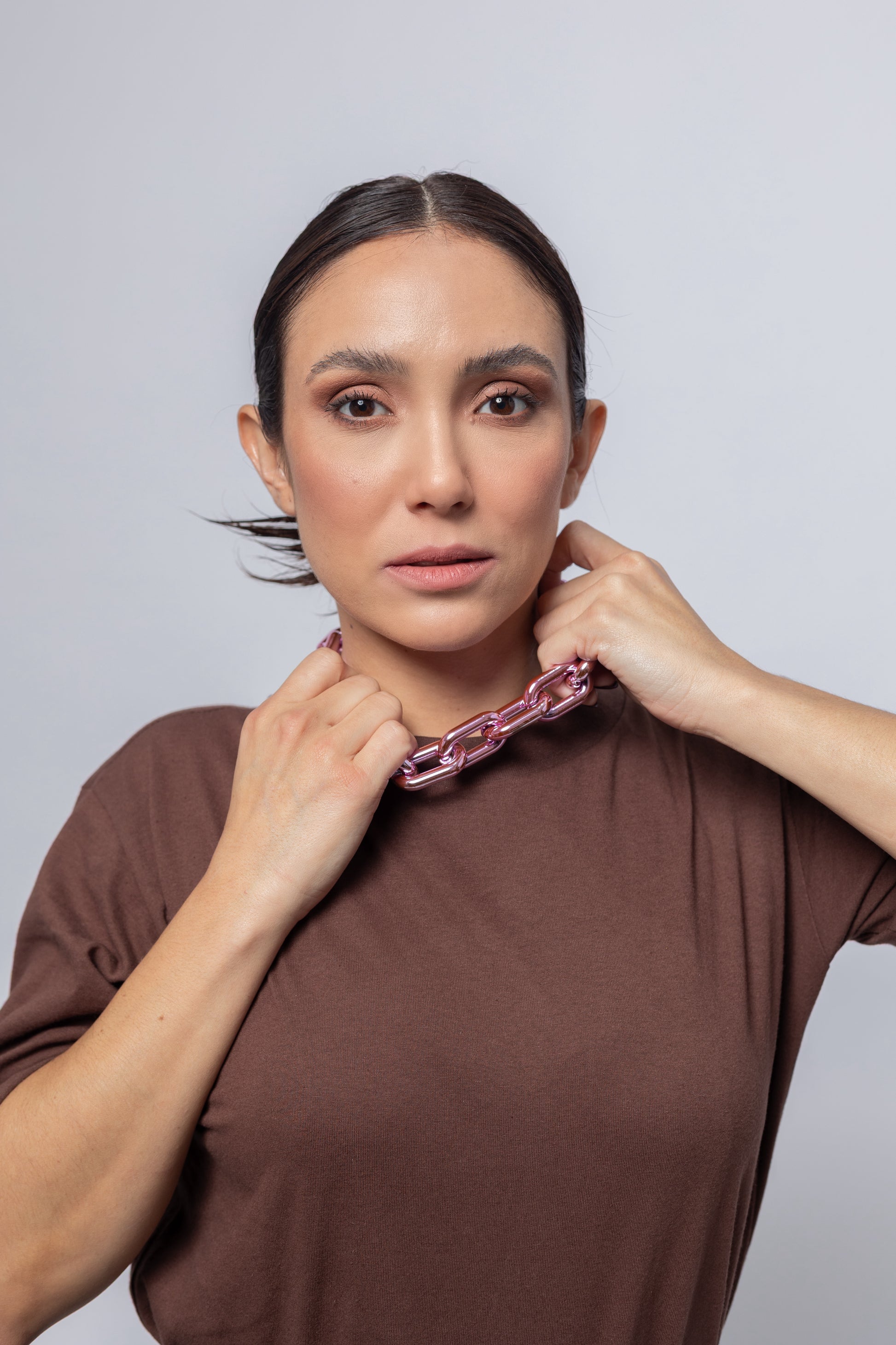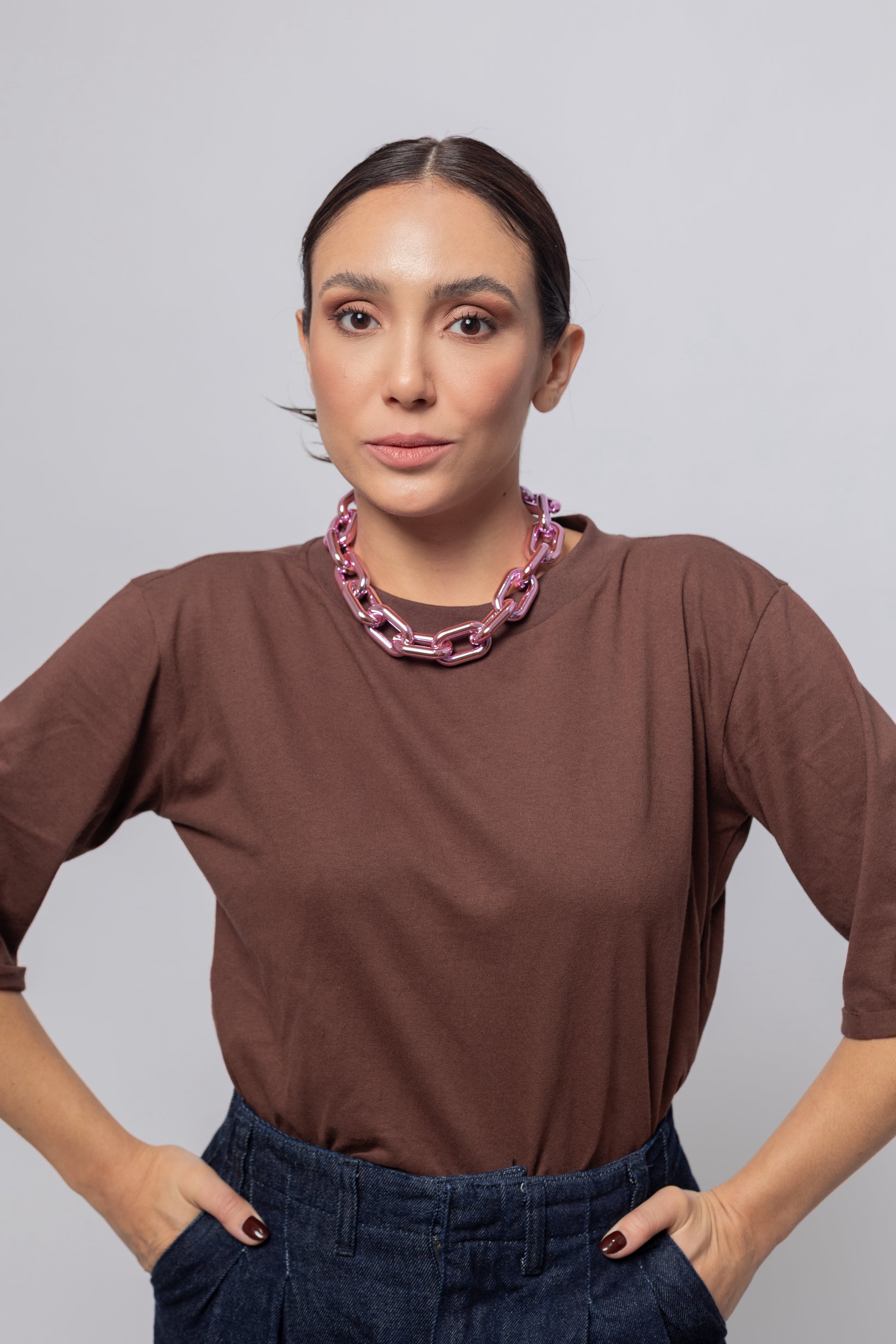 Corrente em prata em banho rosa brilhante, com presença e design atual. Destaque perfeito para combinações monocromáticas ou neutras.