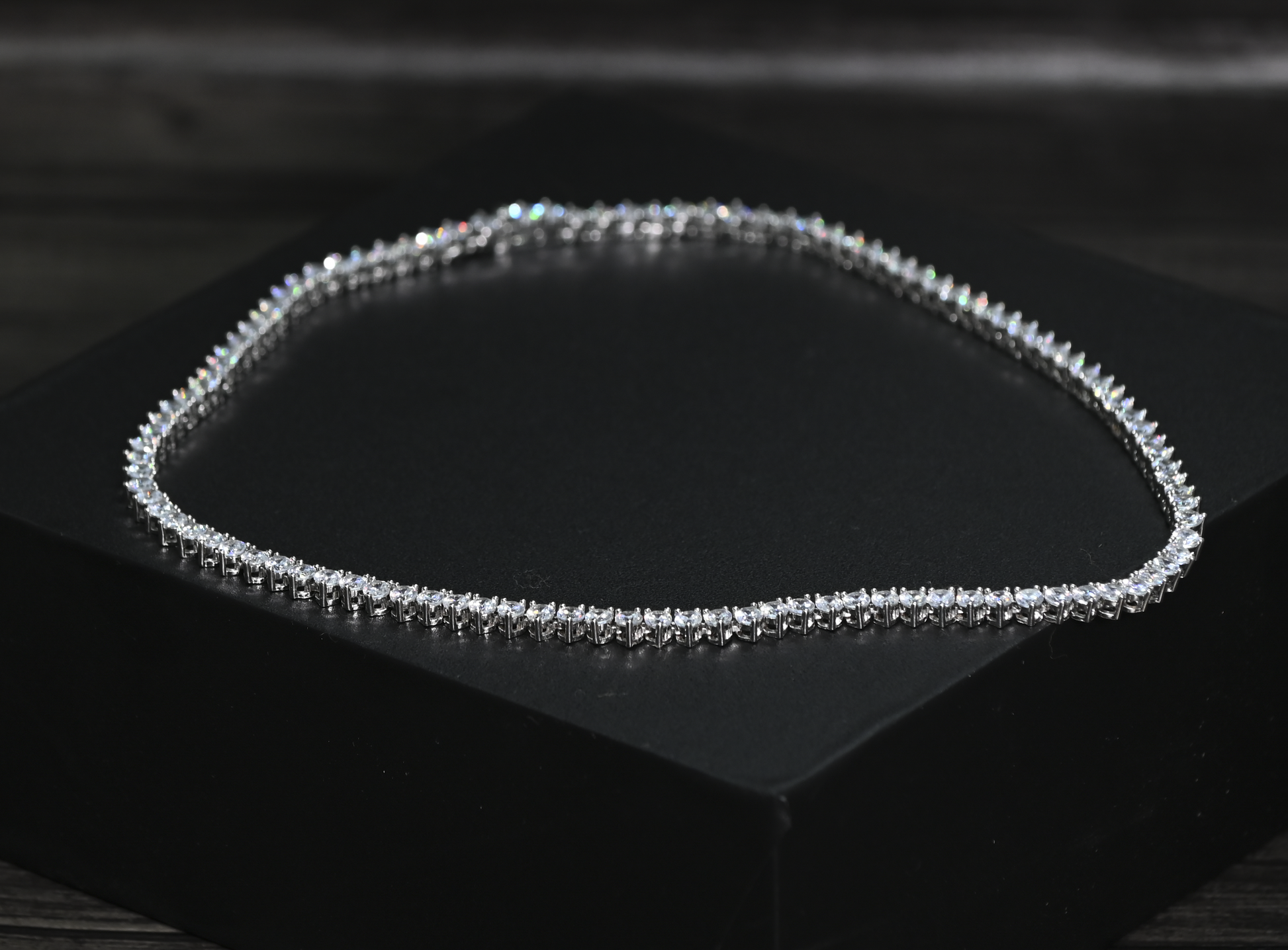 Colar Riviera em banho de prata com fileira contínua de zircônias que refletem brilho intenso e atemporal. Uma peça clássica que traz elegância imediata para qualquer produção, do delicado ao sofisticado.