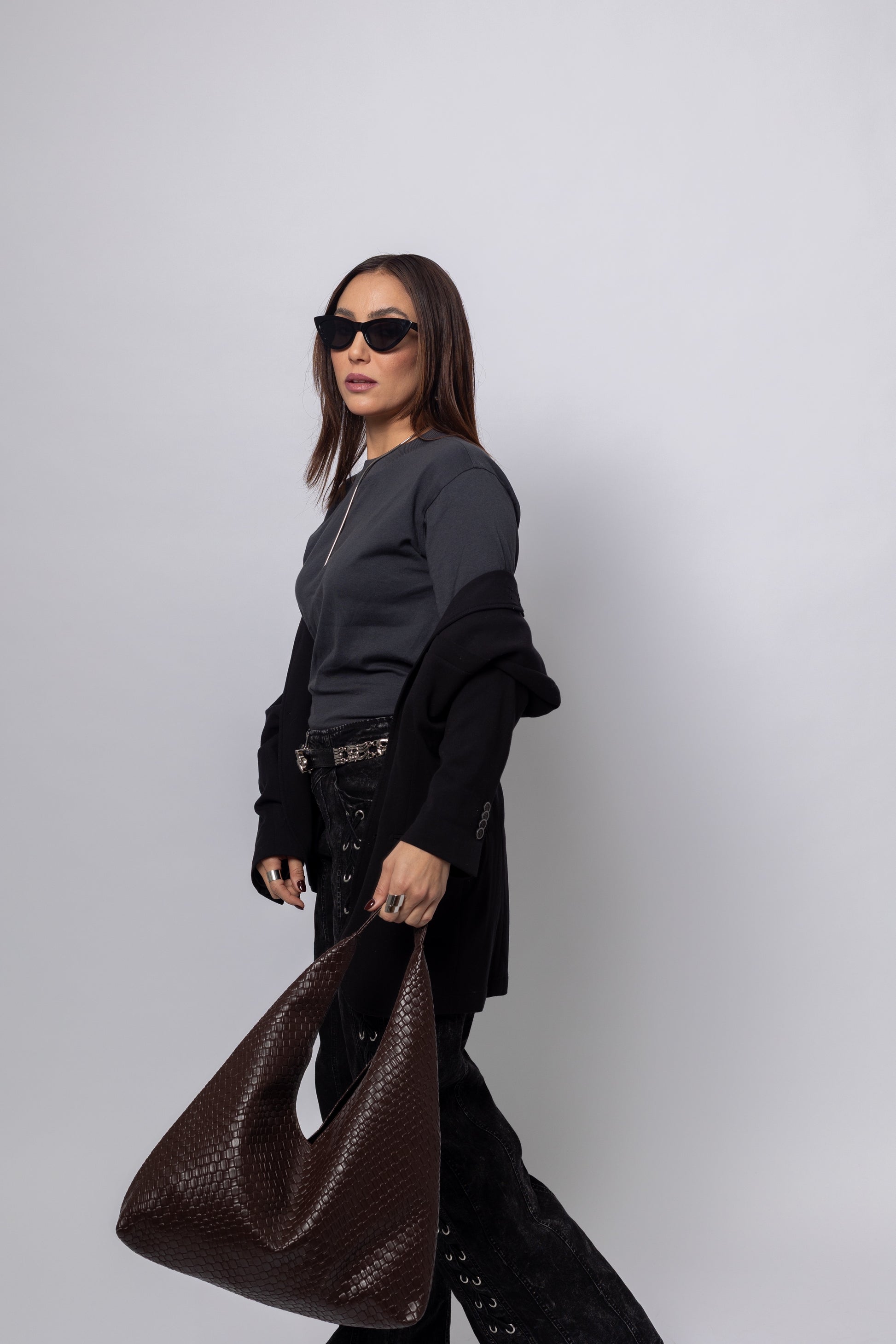Bolsa em courino marrom, prática e moderna, perfeita para acompanhar produções do dia a dia com estilo.